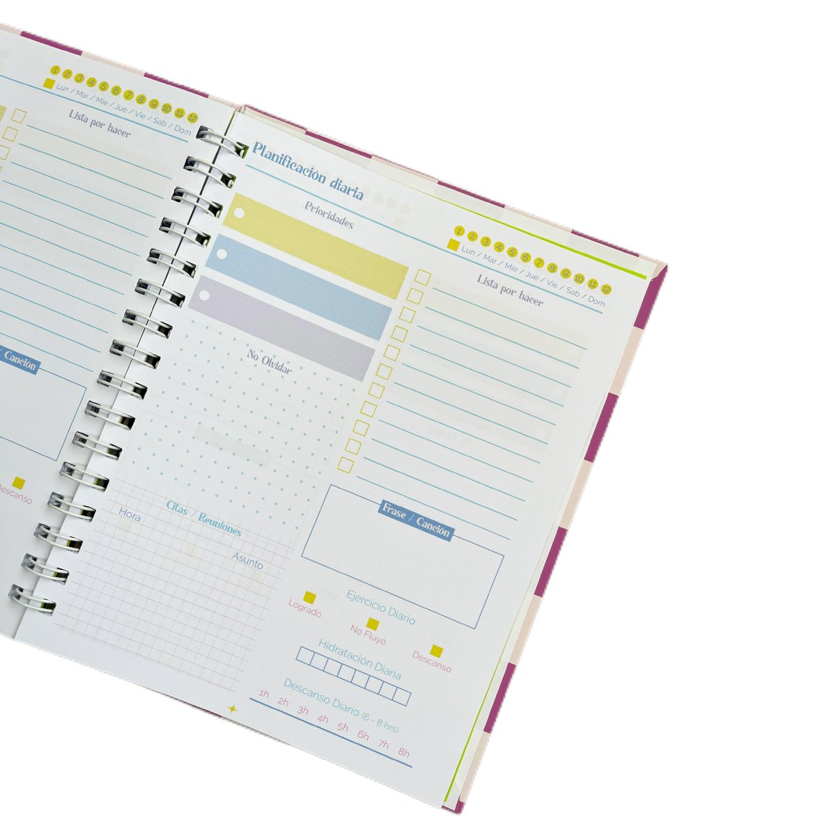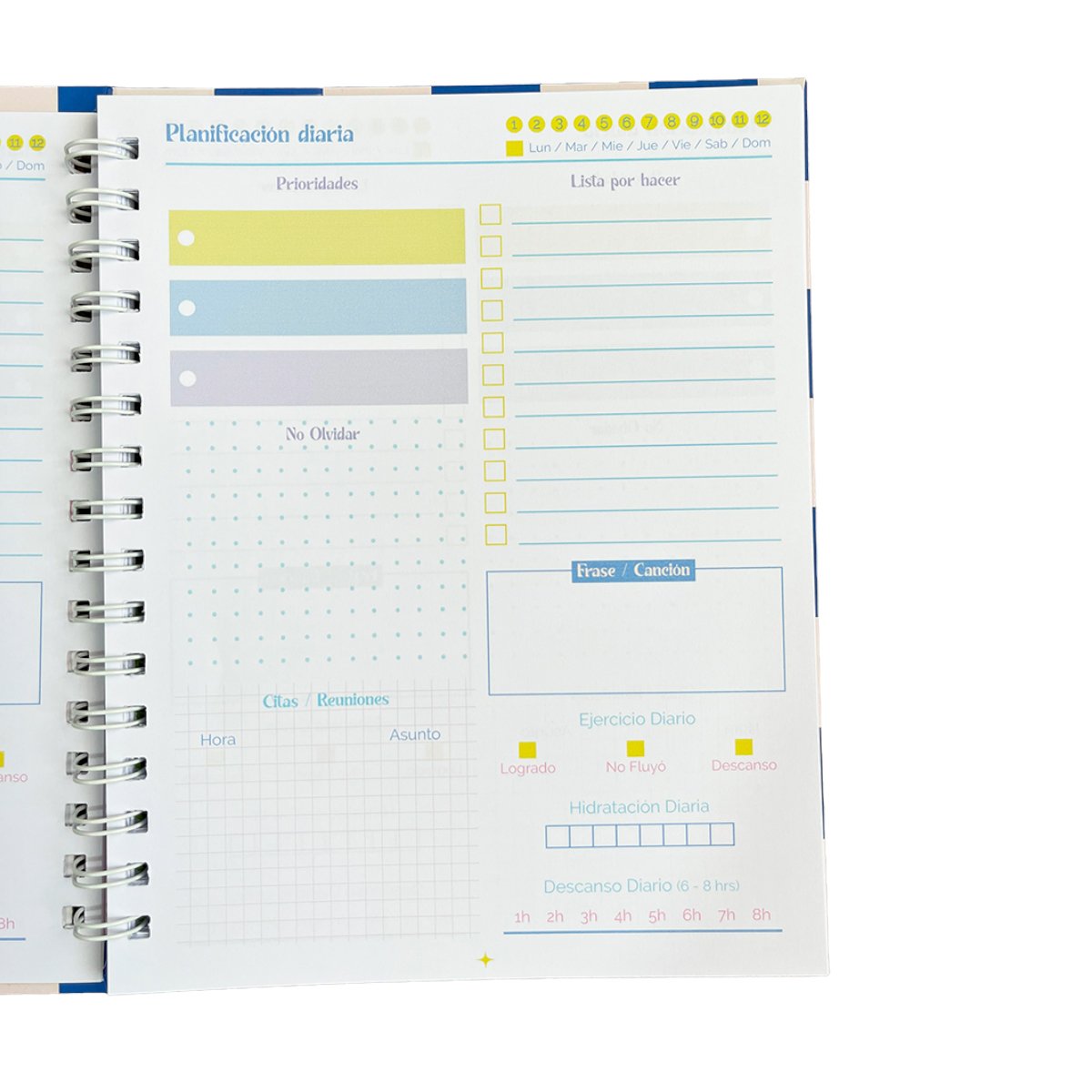 Planificador diario atemporal de la colección Creativas, tamaño 9” x 7”, con 150 páginas de papel de 90 g, suaves y resistentes. Sus tapas duras con laminado premium protegen y realzan el diseño, mientras que el resorte metálico de 1” garantiza durabilidad y un giro de páginas fluido. Cada día incluye espacios para marcar la fecha, organizar prioridades, anotar lo importante, agendar citas/reuniones, listas de pendientes y secciones motivadoras como frase o canción del día, registro de ejercicio, hidratación y descanso, para que tu productividad se combine con bienestar y creatividad.